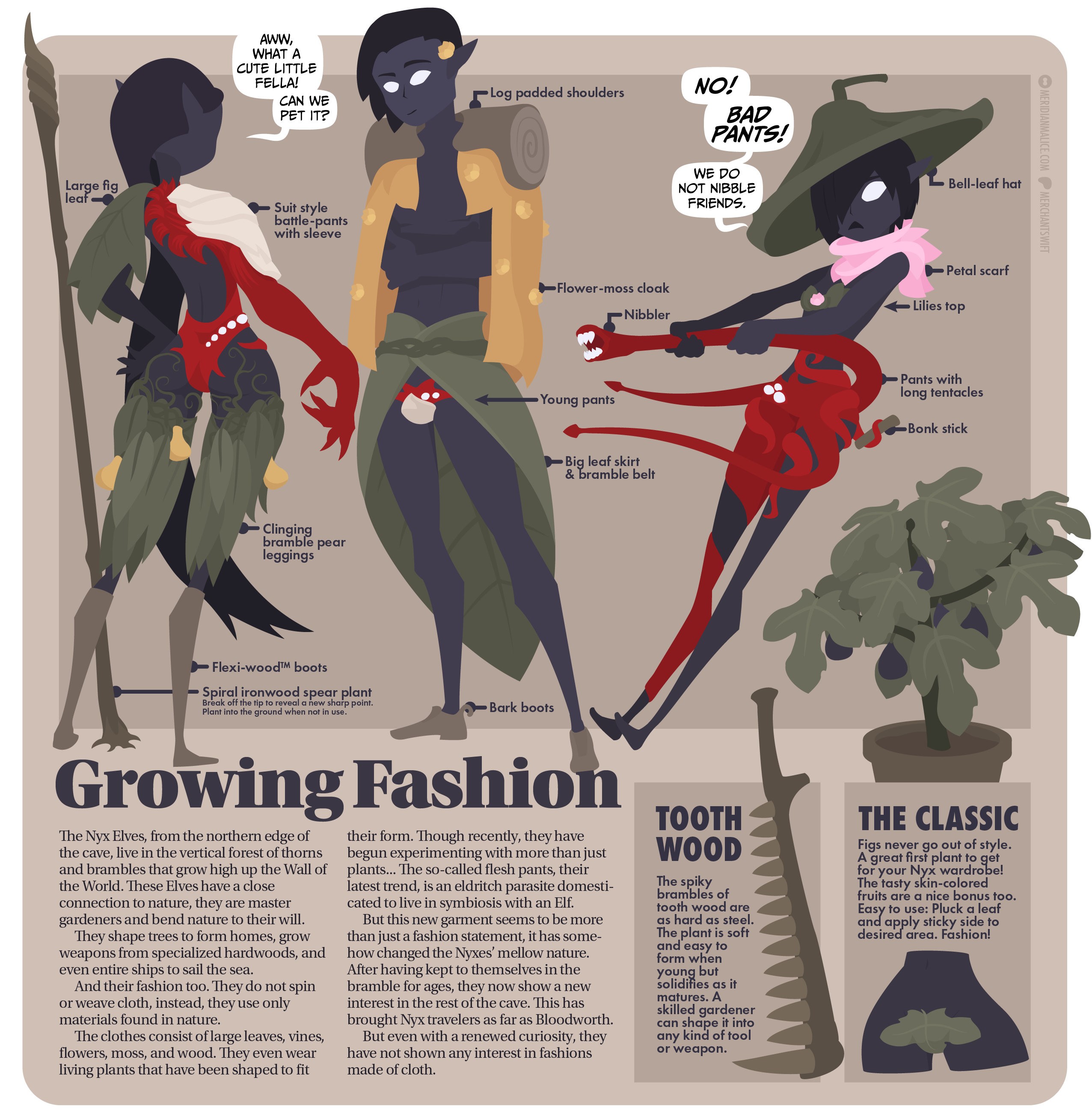 The clothes consist of large leaves, vines, flowers, moss, and wood. They even wear living plants that have been shaped to fit their form. Though recently, they have begun experimenting with more than just plants… The so-called flesh pants, their latest trend, is an eldritch parasite domesticated to live in symbiosis with an Elf.